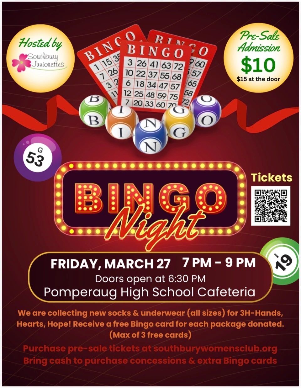 We are collecting new socks and underwear (all sizes) for 3H-Hands, Hearts, Hope! Receive a free Bingo card for each package donated. (Max of 3 free cards).